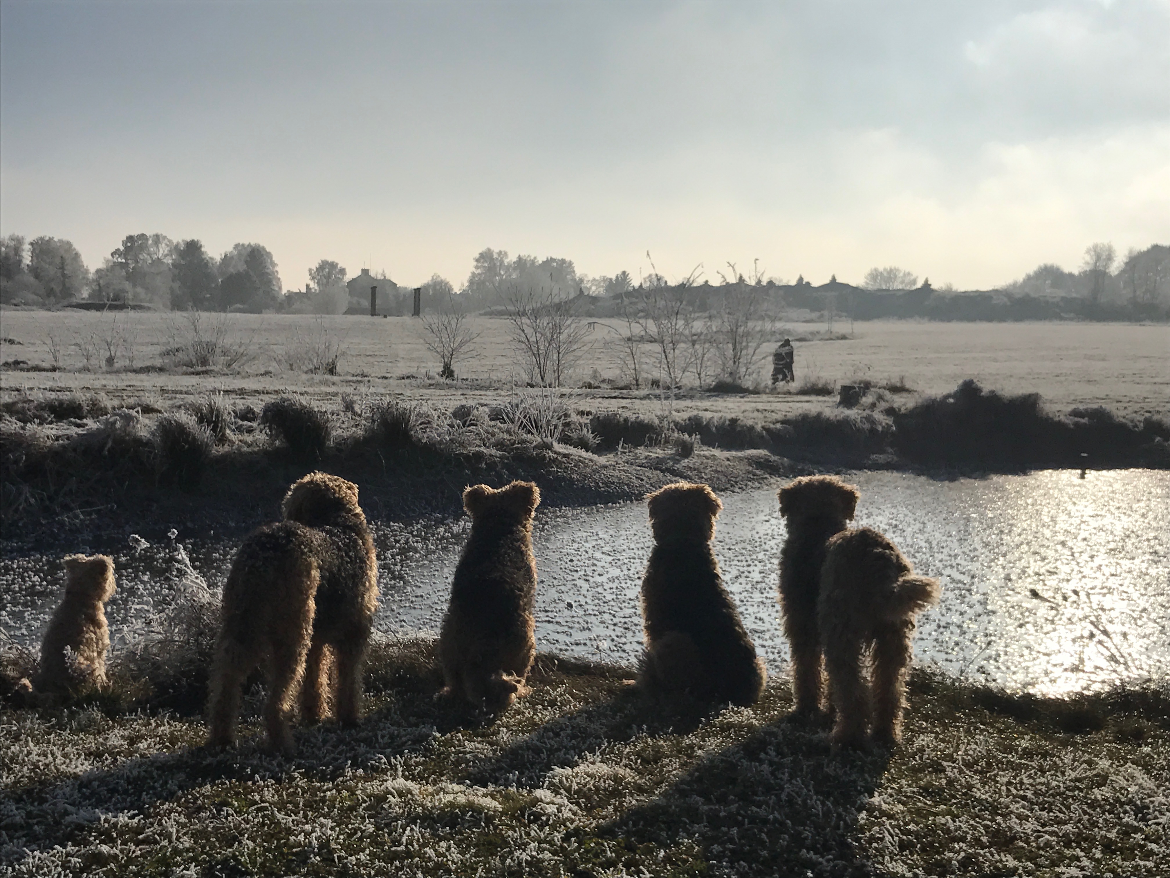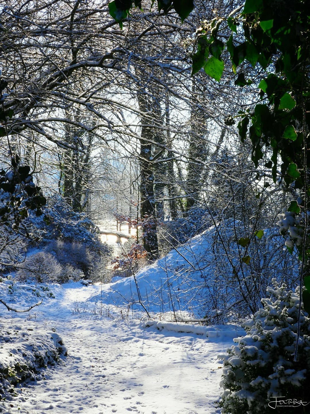 Winter im Schlosspark. Mit Eis auf dem See für meinen Mann, Schneeverwehungen auf den Wiesen und Hügeln, dicken weißen Schneeflocken im Gesicht beim Ausreiten… und Hundestapfen im Schnee!