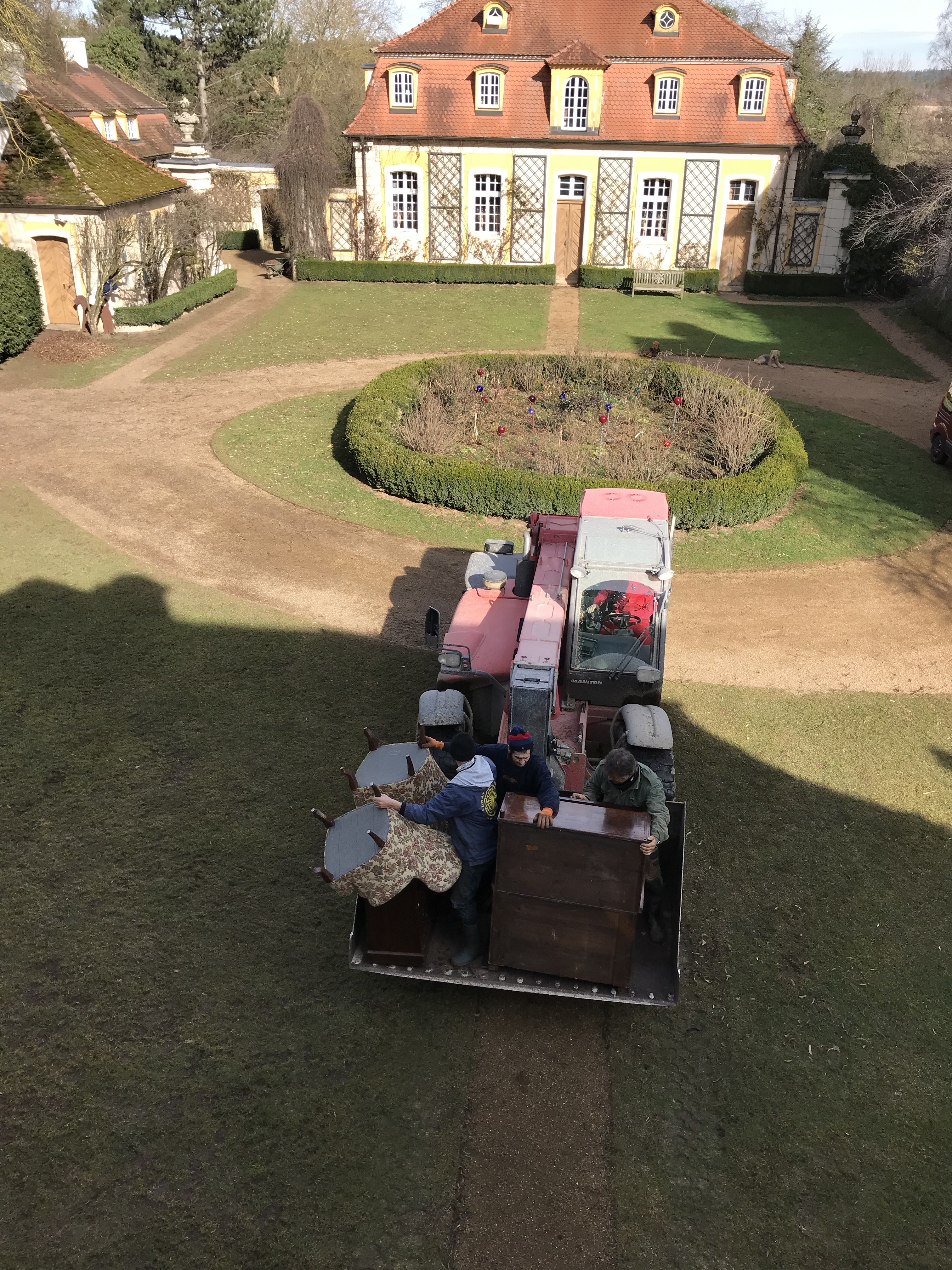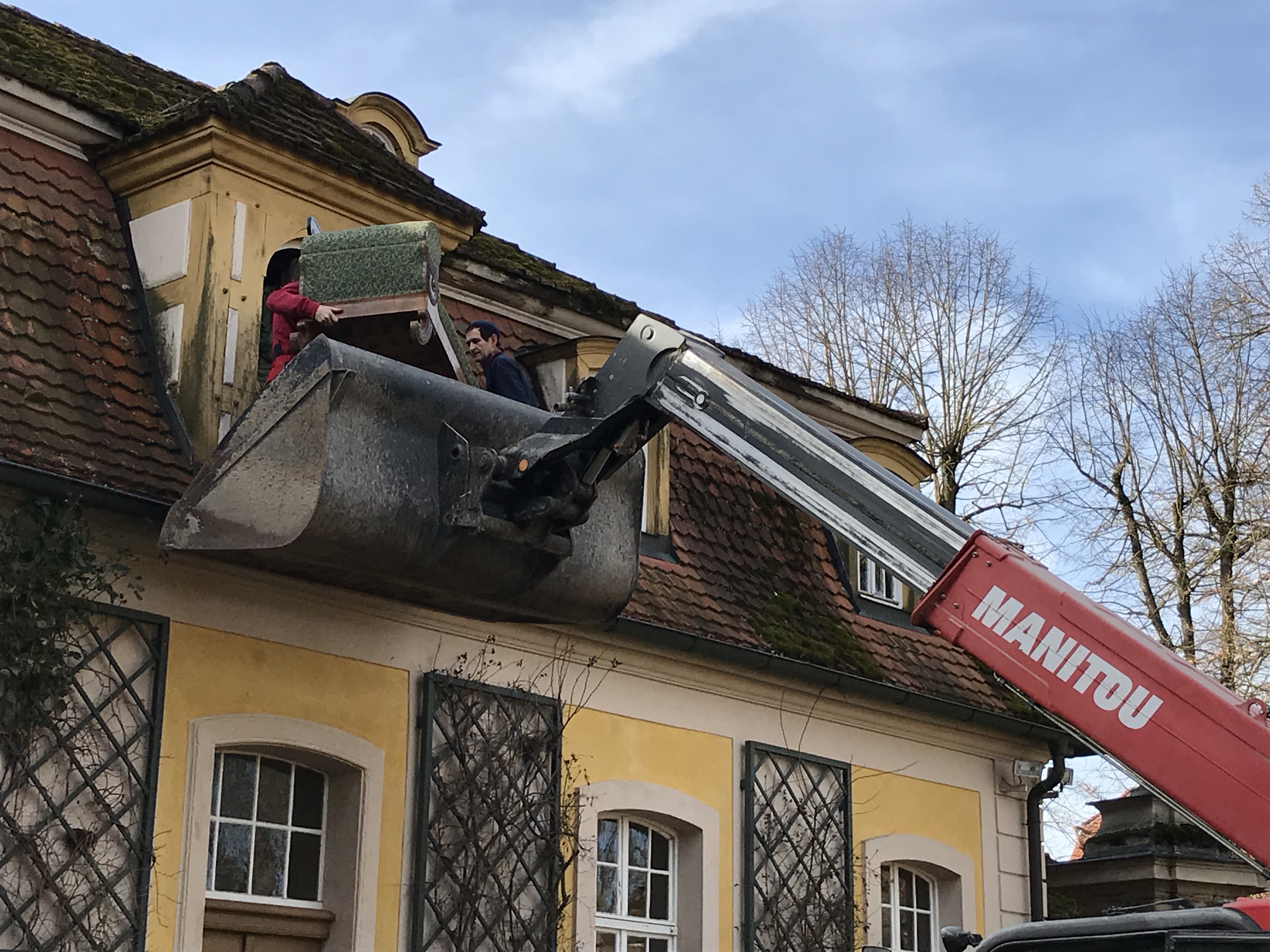 Kurz bevor die Gartensaison losgeht, packt uns immer das Aufräum- und notgedrungenermaßen Renovierungsfieber. Diesmal werden zwei Nebengebäude des Schlosses auf Vordermann gebracht, um die Schäden in den Griff zu bekommen, die im Winter aufgetaucht sind. Also erst mal ausräumen – was tun, wenn das Sofa zu groß fürs kleine Treppenhaus ist?