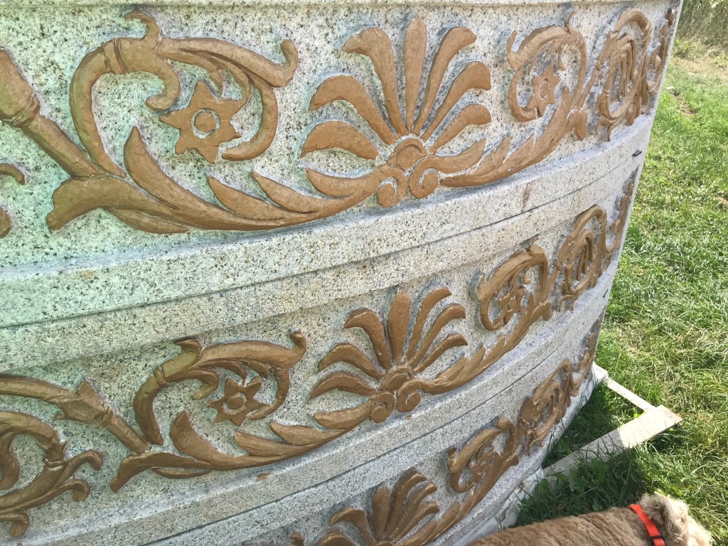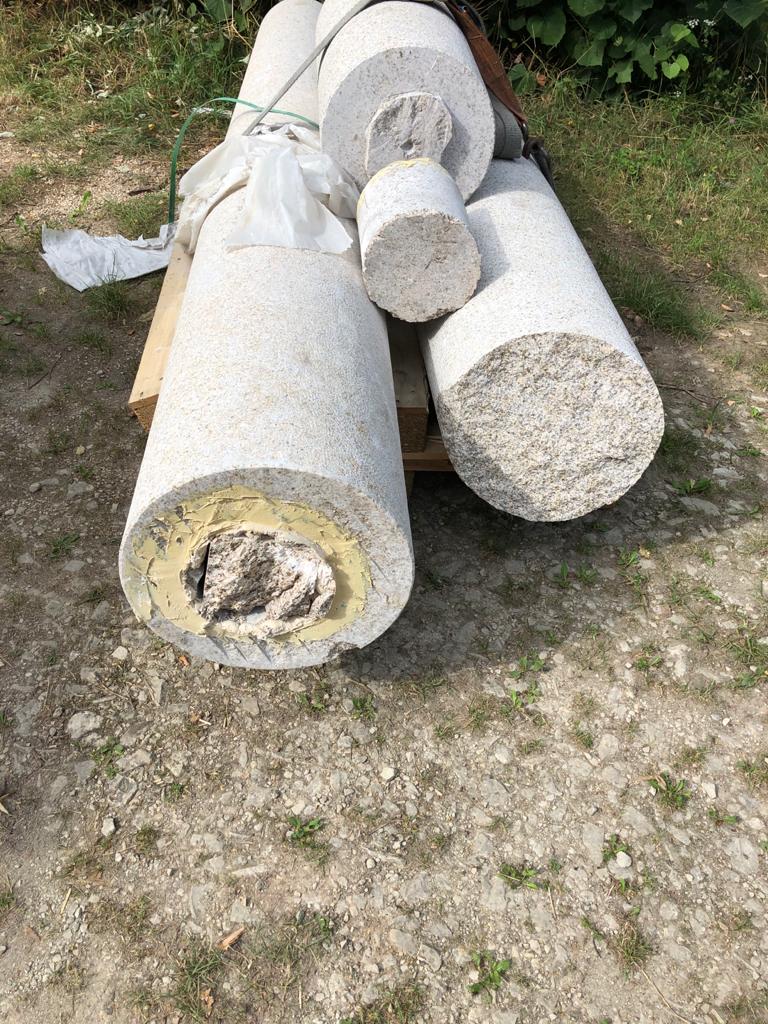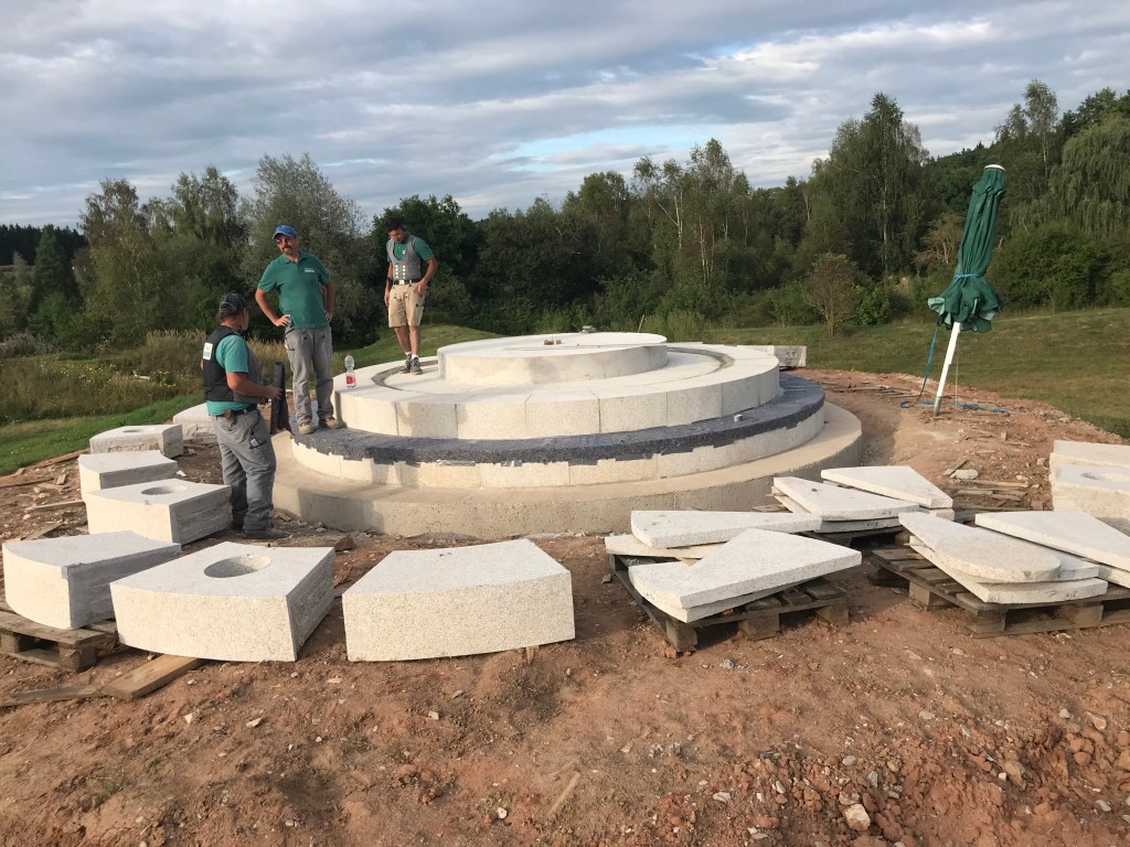 Parallel zum Streit haben wir natürlich mit dem Aufbau begonnen, vier Wochen lang mit 4 Mitarbeitern der Firma Scherer aus Ulm – ein Bauwerk, das es in Franken so noch nicht gegeben hat, wie uns mitgeteilt wurde. Mehrere fränkische Steinmetze haben sich nicht dran getraut… Kran, Gerüst – das volle Programm. Vergoldet haben wir übrigens selbst…