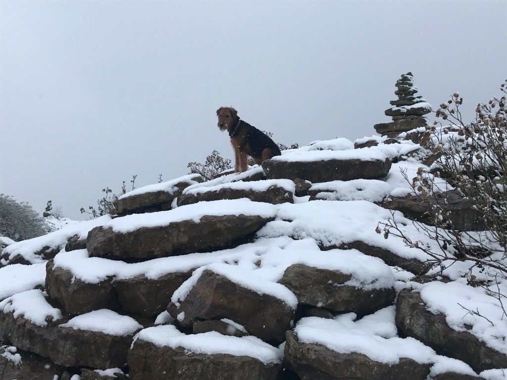 Der grüne Baron war glücklich – konnte er doch bei Frost über die Wiesen fahren ohne etwas kaputt zu machen und weitere Steine vom Parkaußenrand zum Rosenberg fahren. Dort hat er nämlich kurz vor Saisonende noch erweitert, weil ich an dieser Ecke endlich „fertig machen“ will und die wirklich allerletzte Tranche Rosen für März bestellt habe. Die Welpen nutzen den Rosenberg als Aussichtspunkt und erkletterten alle Steinhaufen, um von oben majestätisch in die Weite zu gucken. Hasen oder Rehe in Sicht? Spuren gab es unendlich viele davon im frischen Schnee…