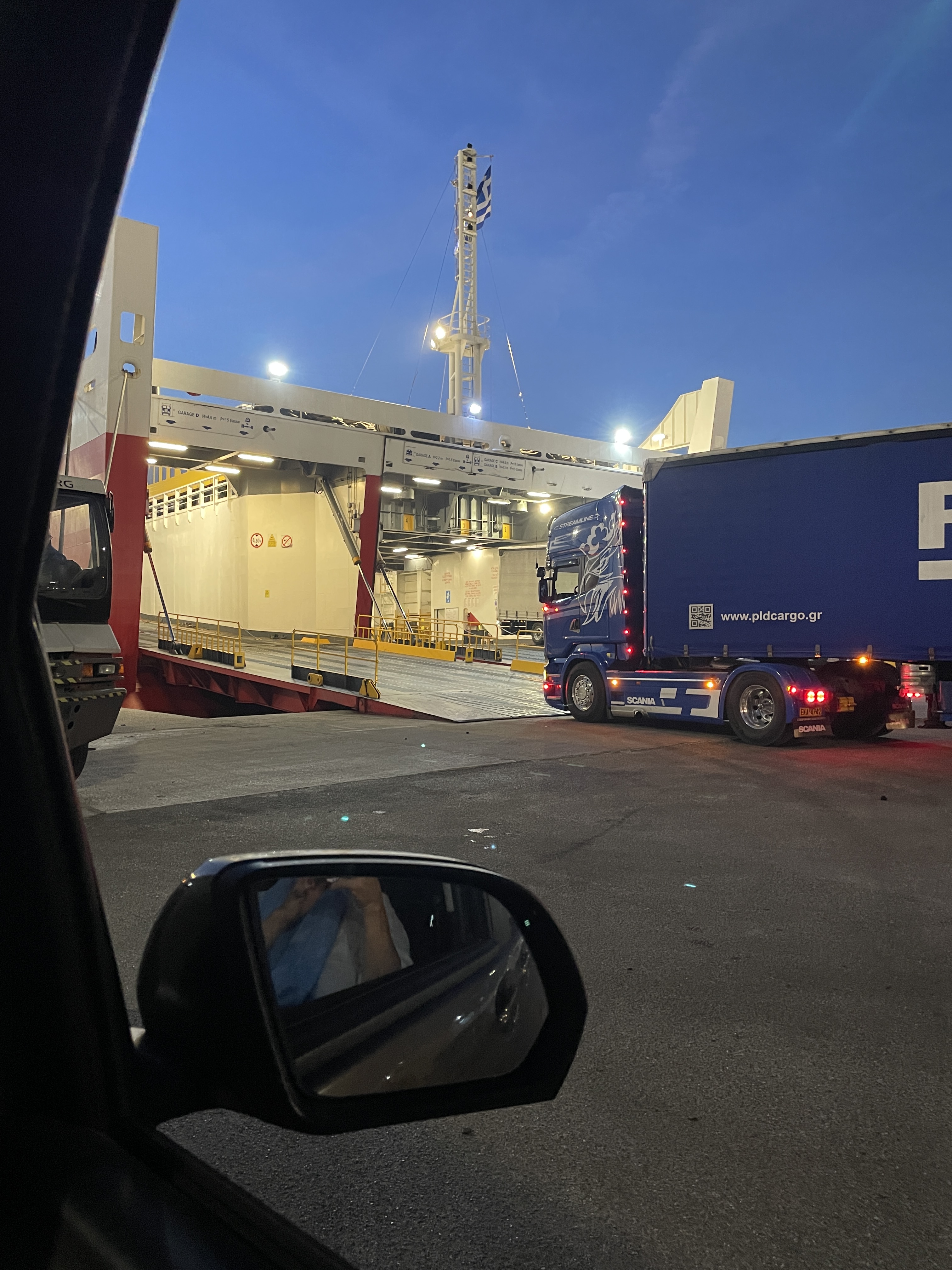 Also auf der Tour nach Griechenland diverse Zwischenstops – sehr schön ist auch Castell del Monte, von Friedrich dem Großen in der Nähe von Bari erbaut, ein schöner Spaziergang rund um das Oktogon, in die Innenräume dürfen die Hunde nicht mit, aber dafür ins danebenliegende Restaurant auf die Terrasse – Katzenfrei, da das Castell fest in wilder Hundehand ist. In Bari geht es dann auf die Fähre nach Igumentisa – zu Beginn hatten wir die Hunde noch in der Kabine mit dabei – das geht allerdings nur mit maximal 2 Hunden pro Kabine und lohnt sich nicht. Die Fähre fährt um 19.30 los und kommt um 5 Uhr früh an, die Autos stehen draussen mit offenen Fenstern und ev. Schiebedach bei schönem Wetter ebenfalls offen – da ratzen die Hunde sehr gemütlich im Auto und sind immer noch ganz verschlafen, wenn wir wieder ins im Morgengrauen Auto krabbeln. Vor 9 stehen sie normalerweise sehr ungern auf – da kommt Ihnen die Rückfahrt immer viel mehr entgegen – 24 Uhr bis 9 Uhr früh.