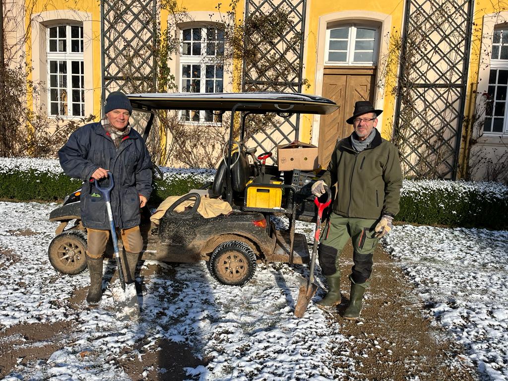 Dem grünen Baron wurde es aber trotz alledem nicht langweilig, denn wir haben überraschender Weise kurzfristig 30.000 Blumenzwiebeln von der Firma Küpper als Spende für den Schlossverein e.V. bekommen- und da ich gerade letzte Woche am Leistenbruch operiert wurde und daher ein paar Tage nur auf dem Sofa liegen kann, war er ganz schön beschäftigt. Als Ergebnis läuft er jetzt schon wieder recht krumm und bucklig rum, obwohl seine Leistenbruch OP erst einige Monate her ist. Aber da muß er durch – und einen tollen Helfer hatte er zumindest!