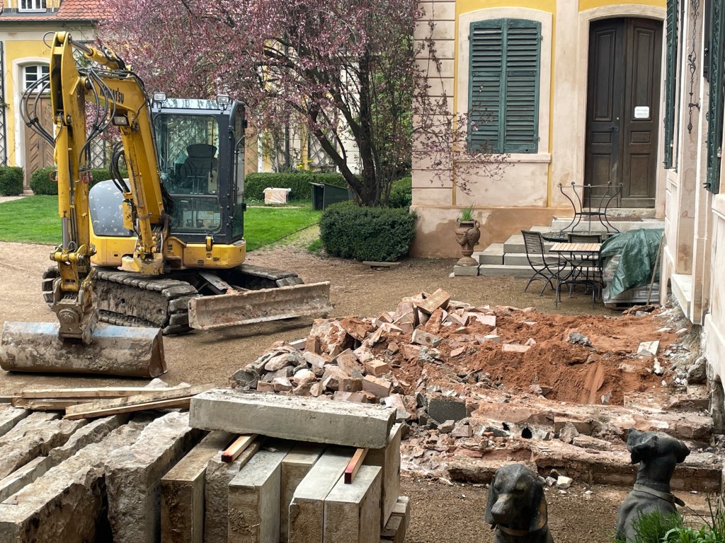 Also durfte der grüne Baron das alte Fundament wegbaggern und jetzt brauche ich schnell 12.000 Euro für ein neues Betonfundament und mehrere tausend Euro für das Geradeschneiden der „ungeraden“ Steinstufen. Dieses Budget war aber gar nicht eingeplant, denn nächste Woche kommen 160 neue Thujen als Ersatzpflanzungen fürs Labyrinth und einige andere Pflanzen für die vielen Baggerlöcher und das sollten eigentlich mit den neuen 2.200 Taglilien alle „Frühjahrsausgaben“ im April sein.