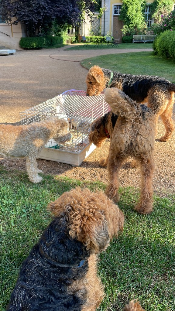 Was gibt es sonst neues in Dennenlohe? Wir ziehen vier kleine Brahma Hühner in der Küche groß und sie wachsen rasend schnell. Die Hunde bewachen sie gut und wenn die vier im Käfig raus auf die Wiese dürfen, ist sich die Hundebande noch nicht ganz sicher, ob sie sie als Hühner und damit unantastbar anerkennen oder ob sie denken, es ist leichte Beute. Auf jeden Fall ist es wie Fernsehen für die Sieben, nur aufregender als ARD und ZDF.