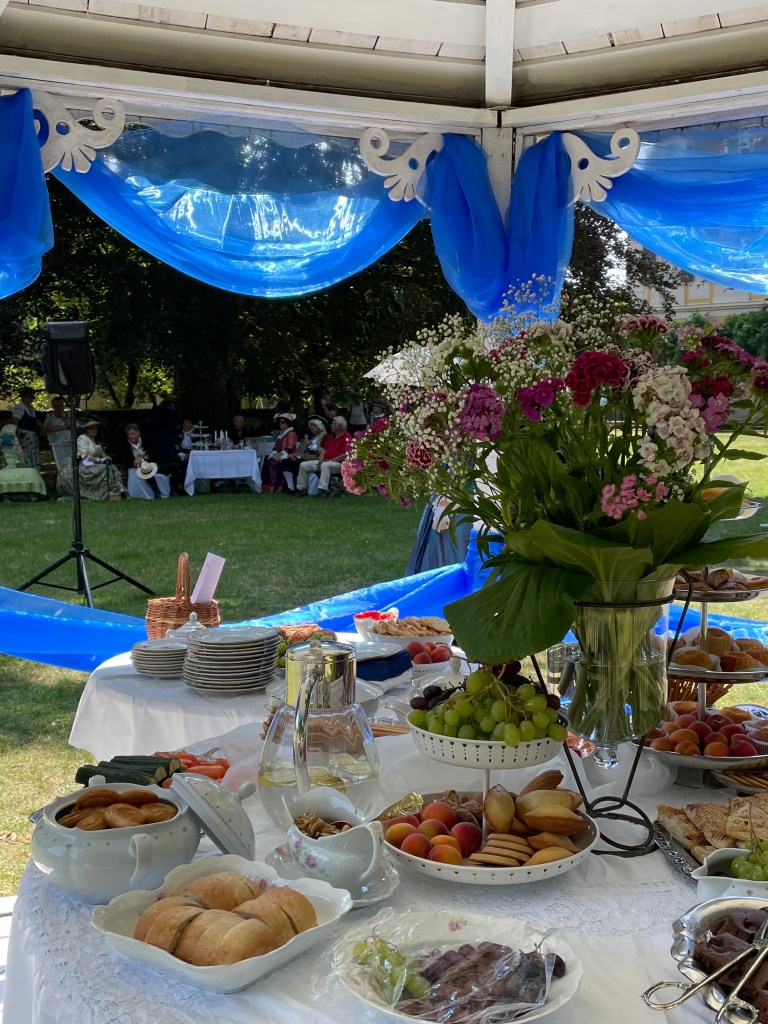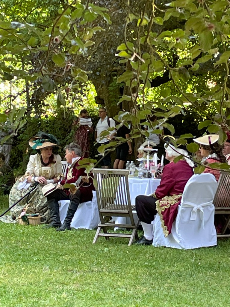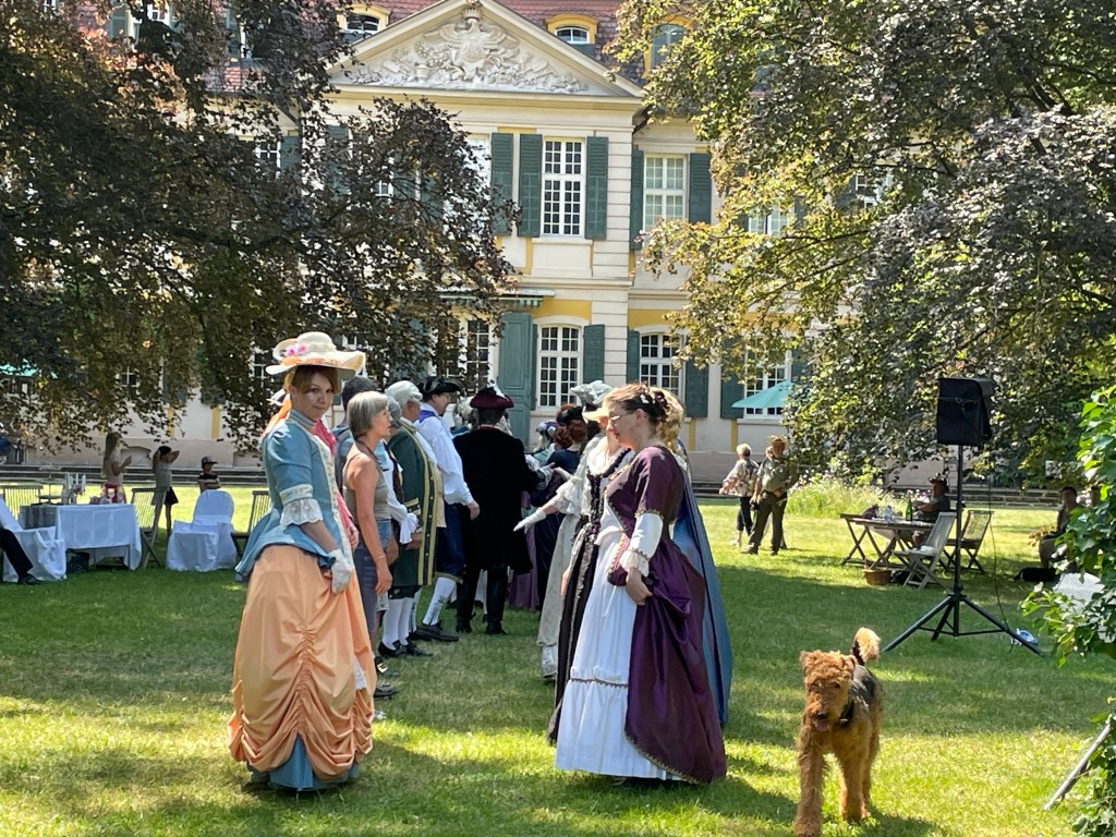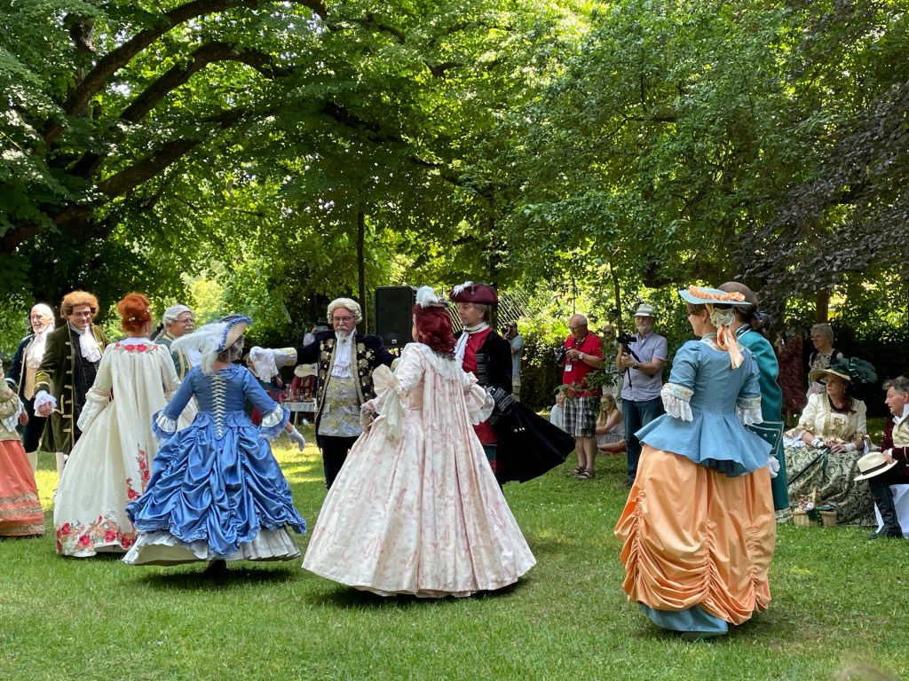 Während die jüngeren Mitarbeiter bereits nach einem Tag schöner Sonne einen Sonnenstich haben und sich erholen müssen oder nach einem Wochenende arbeiten um ihre „work-life-balance“ fürchten, ist das natürlich in unserer Generation noch ganz anders. Weiße alte Männer, wie es so schön heißt, lieben es Steine zu schleppen und bei brütender Sommerhitze mit dem Freischneider Schilf zu kürzen, denn das bedeutet, fit zu sein – genauso wie die Barocktanzgruppe letzten Sonntag mit Perücken und Kostümen bei 28 Grad „Contenance“ bewahrt hat und alle Tänze und Vorführungen plangemäß und mit großem Spaß und guter Laune durchgeführt hat. Immer am Dennenloher Barocktag ist nämlich extrem schönes Wetter – letztes Jahr waren es 38 Grad, der gefühlt heißeste Tag des Jahres 2022 und dieses Jahr hatte es gerade 10 Grad weniger. Schauen wir mal, ob wir bei 18 Grad nächstes Jahr landen können…da wollen der grüne Baron und ich nämlich auch endlich in standesgemäßen Kostümen durch den Lustgarten wandeln und er reicht mir die behandschuhte Hand zum Tanz. Und es dürfen diesmal keine Stihl Arbeitshandschuhe sein!