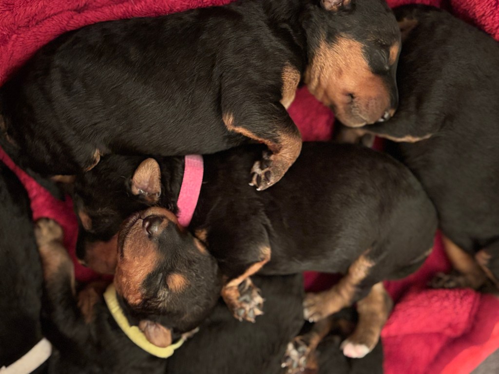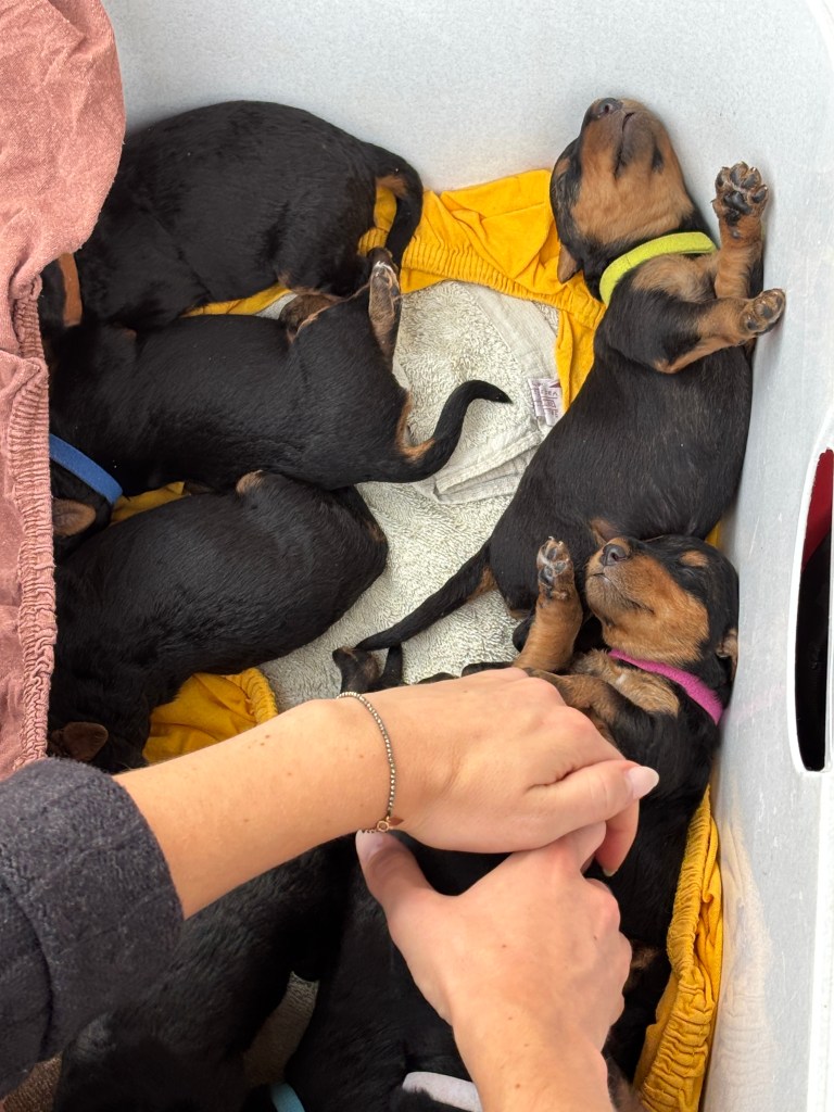 Lotte und Max Maximus haben geliefert – und wie! Als „Spätgebärende“ – wie es so leicht diskriminierend heißt, obwohl Lotte gerade erst 5 geworden ist, sollten es laut Ultraschall zwischen 7 und maximal 9 Welpen werden, tatsächlich wurden es 10 kleine wilde Racker. Die ersten vier Buben, uff – ich hatte zum Zeitpunkt der Geburt nur Mädchen verkauft, kamen ganz schnell, dann ein Mädchen und ein weiterer Bub. Dann ganz lange Pause, weil Nr. 8 sich die Nabelschnur abgerissen hatte und mit der Schwanzspitze ohne Eihülle herauskam. Nr. 9 hat aber dann die Nachgeburt mitgebracht und dann waren wir glücklich. Lotte war spazieren und fressen und ich ging nach 22 Stunden Hebammentätigkeit in die Dusche. Kaum kam ich raus, wollten wir die Welpen in die Wurfkiste in den ersten Stock ins Bett bringen. Da hatten wir bereits einen Welpen ohne Halsband, ich dachte, das geht ja schnell mit dem Verlieren, wir zählen durch und siehe da, alle Halsbänder dran, aber ein Welpe mehr im Körbchen….