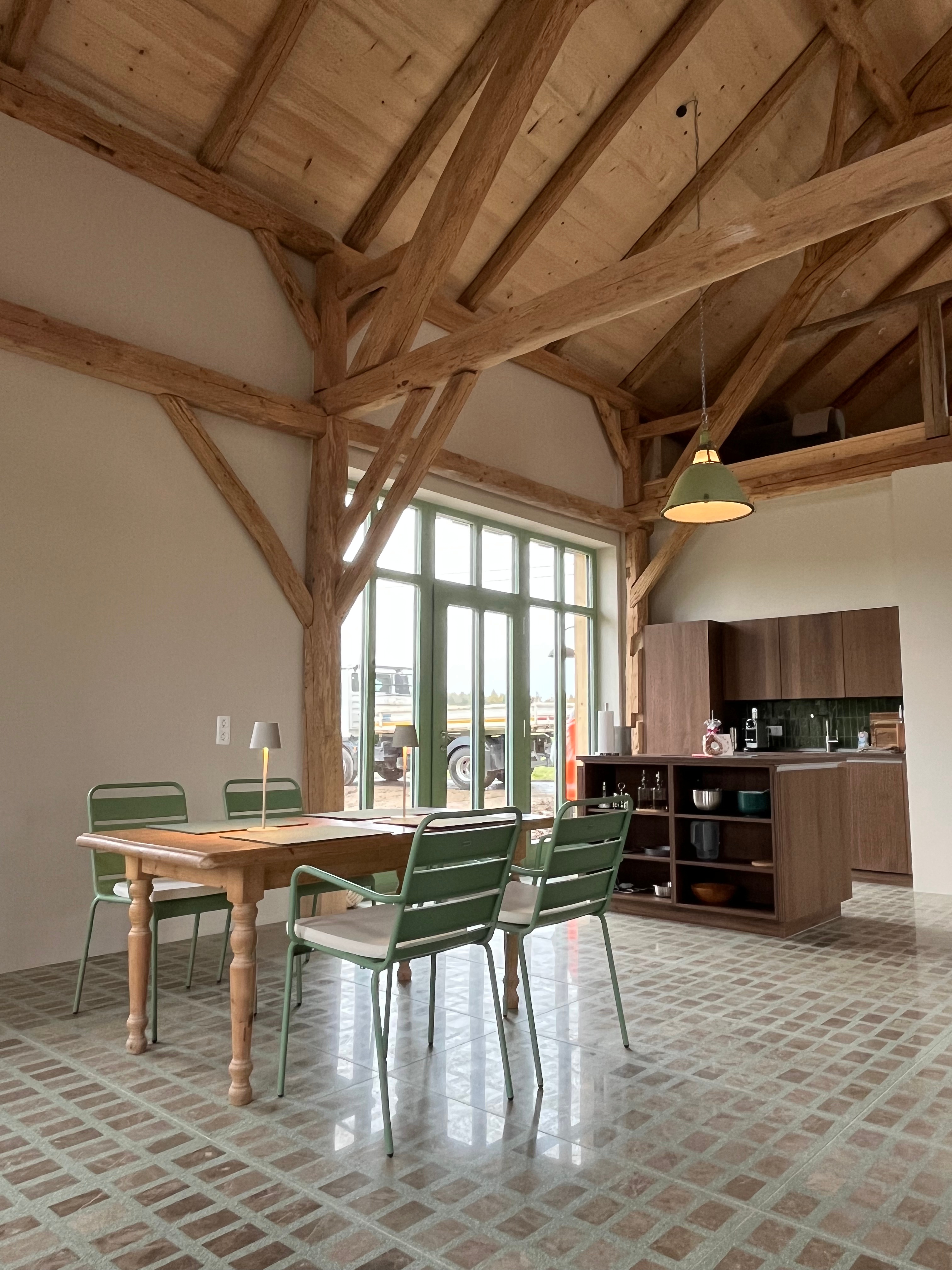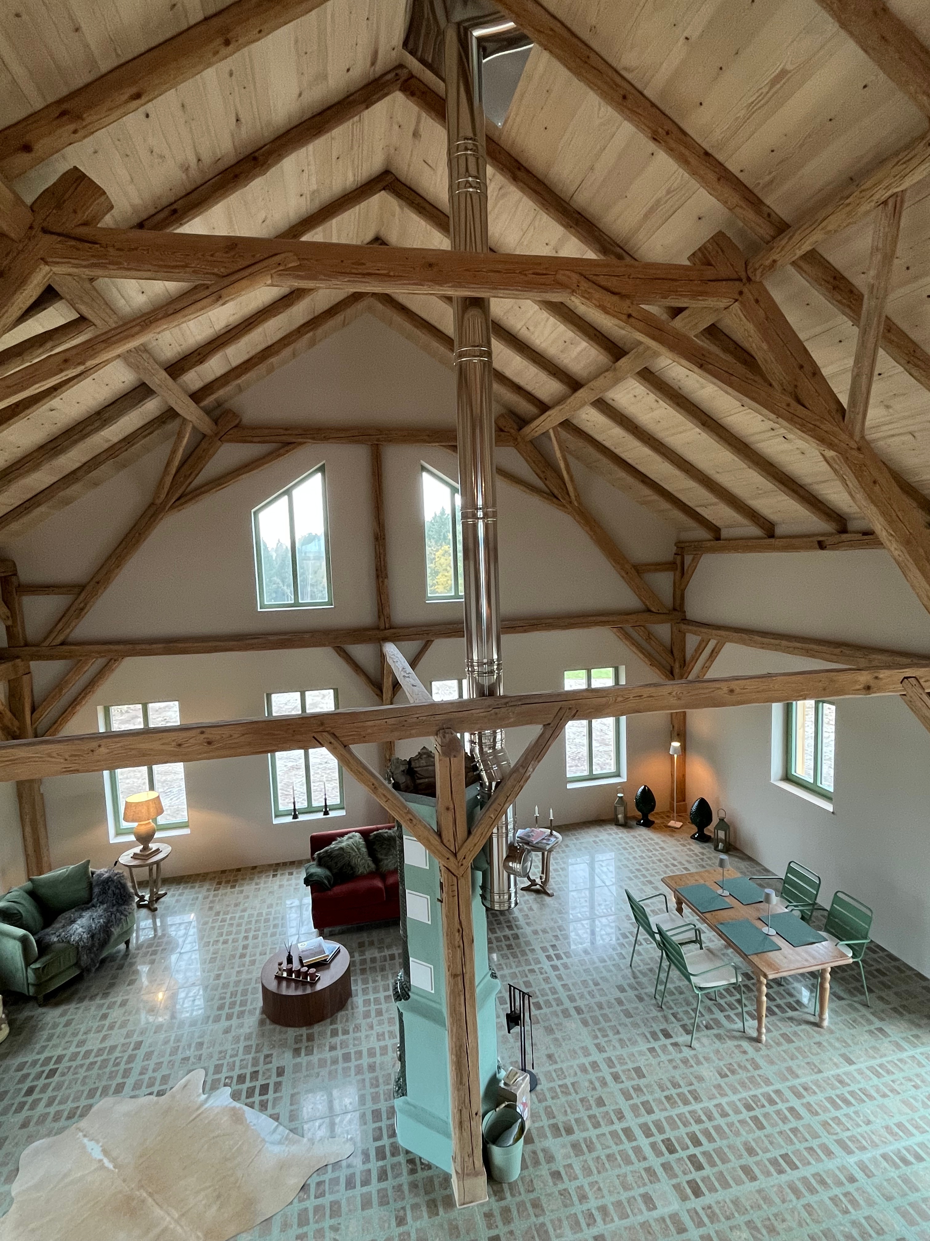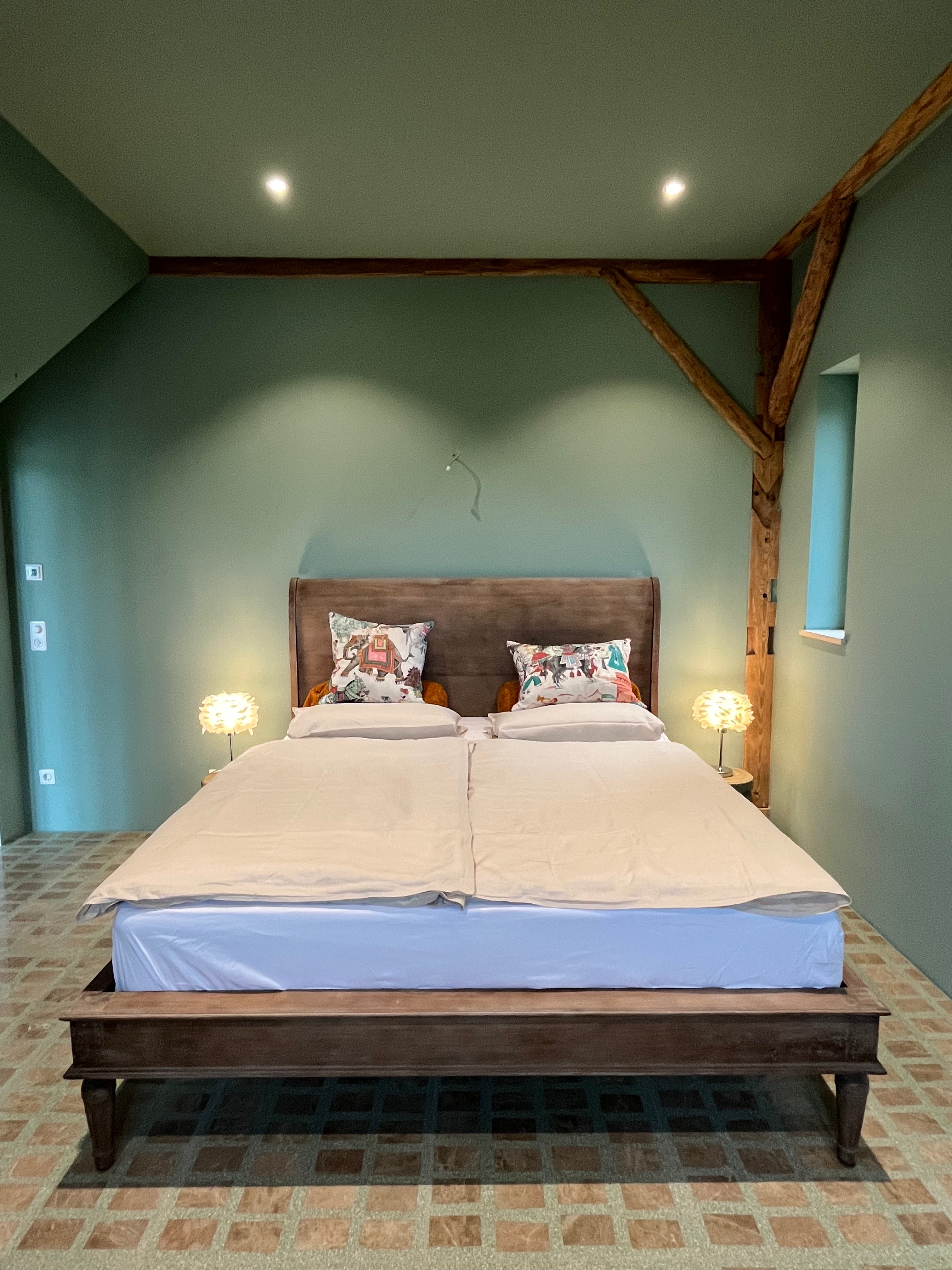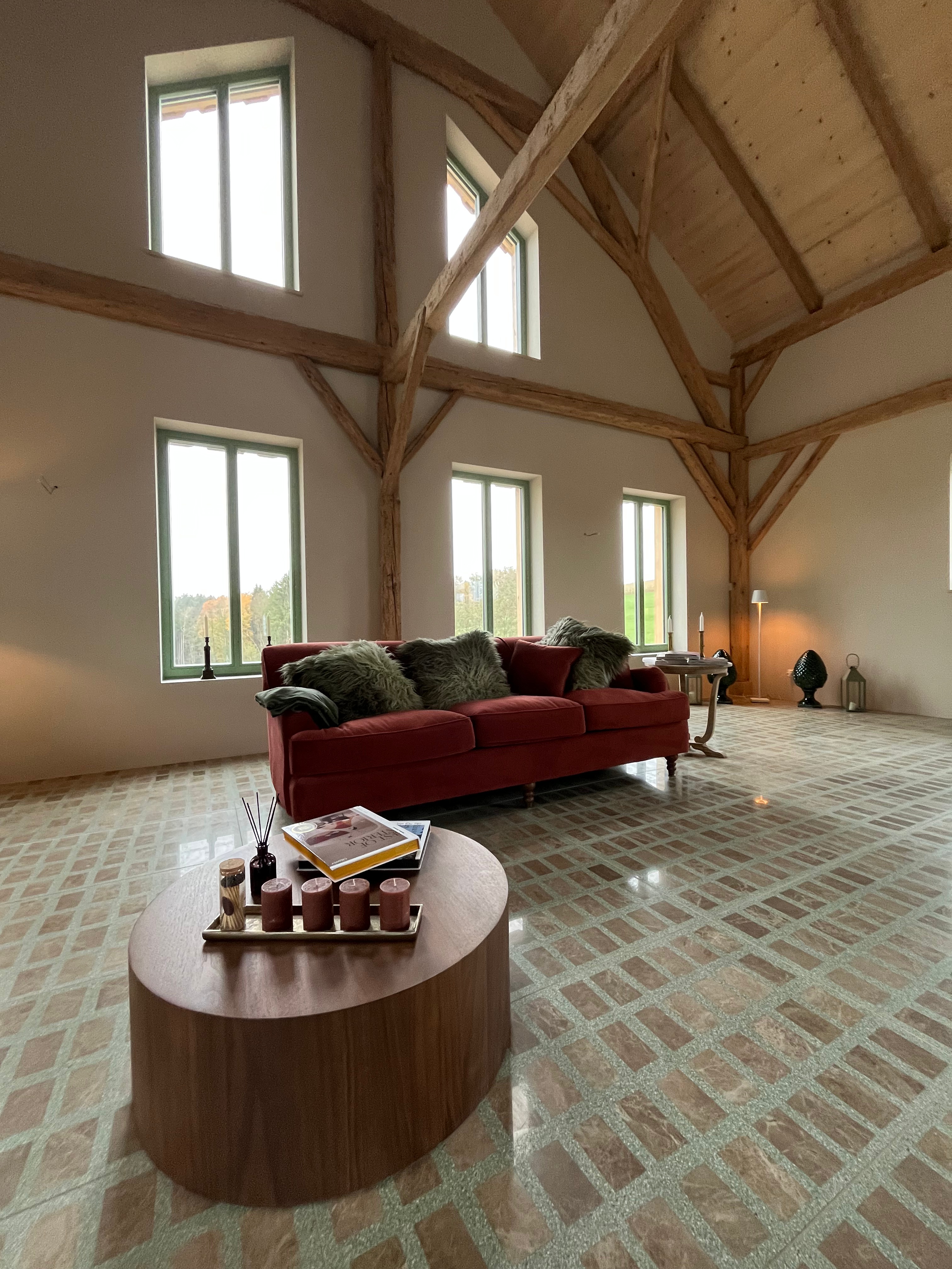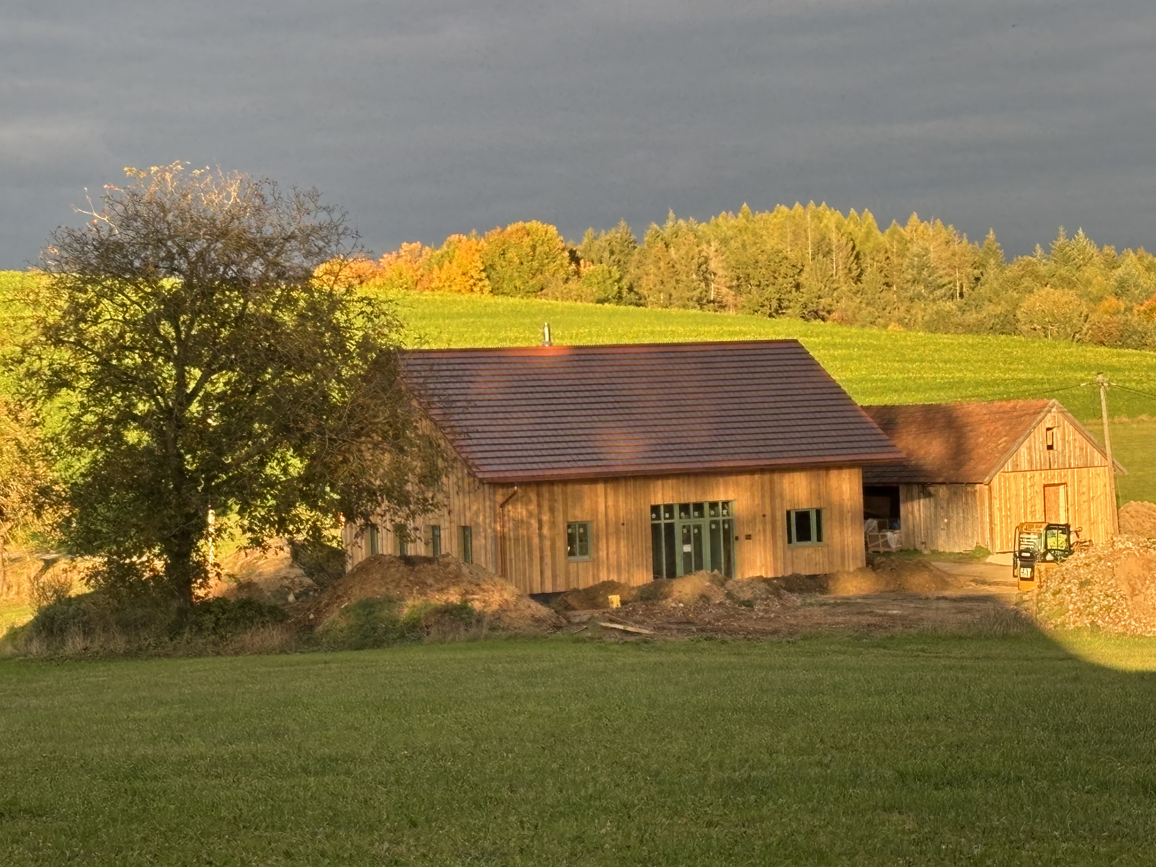 Wie immer geht es bei Süsskinds knapp zu, der „Fremdbagger“ war letzte Woche kurz vor meiner Abreise da (der grüne Baron war schon ganz unglücklich darüber, daß er nicht selbst baggern konnte) und hat die letzten Erdhügel verteilt, nächste Woche kommen die alten Granitplatten auf die Terrassen und die Maler werden statt morgen erst Dienstag fertig. Uff. Aber ich hab vor der Abreise nach Frankreich schon mal die Bilder aufgehängt, das Bett, Tische und die Sofas zusammengebaut. Man muß ja in irgendeiner Ecke anfangen und wir sind mit der Fertigstellung 4 Monate in Verzug, weil vieles doch sehr zäh geht. Zum Beispiel schließen die Bayernwerke seit Wochen keine Hausanschlüsse an, weil sie Ihre Software umstellen – der absolute Wahnsinn. Ab 30. Oktober ist diese tolle Scheune nämlich bereits das erste Mal vermietet an Personen, die das Besondere lieben und jetzt einfach den Baustrom weiter nutzen sowie den eigenen Strom., den die sagenhaften terracottafarbenen Solarziegel selbst produzieren. Irgendwie geht’s schon weiter… auch hier trotz strömendem Regen die ganze Zeit und vielen fehlenden Lampen und Tischen…
